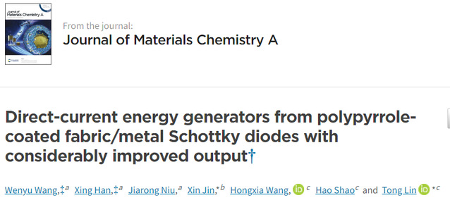 米优app下载安装官网纺织科学与工程学院王闻宇副教授和林童教授课题组在纳米发电机直流发电集成化研究领域取得重要进展,相关成果以“Direct-current Energy Generators from Polypyrrole-coated Fabric/Metal Schottky Diodes with Considerably Improved Output”为题,发表在国际期刊《Journal of Materials Chemical A》(影响因子为11.3),王闻宇副教授与纺织科学与工程学院的博士生韩幸为该论文的共同第一作者。