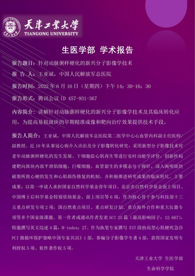 报告人简介:王亚斌,中国人民解放军总医院第二医学中心心血管内科副主任医师/副教授。近10年从事冠心病介入诊治及分子影像转化研究,采用新型分子影像技术对老年动脉粥样硬化的发生发展、干细胞促心肌再生等进行实时功能学评价,创新性构建靶向斑块内部平滑肌细胞、巨噬细胞、血管新生的多模态分子探针,深入阐明斑块破裂所致心梗的发生和心肌损伤修复的机制,并积极推进研究成果的临床转化。主要成果:以第一申请人承担国家自然科学基金青年项目、北京市自然科学基金面上项目、中国博士后科学基金特别资助基金、面上项目等6项,作为核心骨干参与科技部十三五重点研发专项2项,国自然重点项目、重点研发计划、重点海外合作和重大仪器专项等多个国家级课题。第一作者或通讯作者发表SCI 25篇(最高影响因子:12.667),特邀撰写英文综述4篇,H-index:27。作为执笔专家撰写《ST段抬高型心肌梗死急诊PCI微循环保护策略中国专家共识》1部,参编分子影像学专著4部,获得国家发明专利授权5项、软件著作权5项。