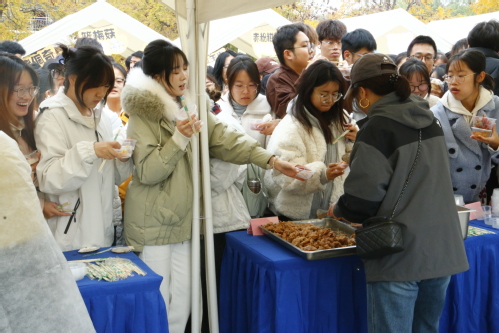 膏满黄肥的大闸蟹、鲜香弹牙的小龙虾、皮脆肉嫩的烤鸭、滋滋冒油的羊肉串,各式花馍等风味全部免费供应。晶莹剔透的糖葫芦裹着薄脆糖衣,刚出炉的烤红薯外皮焦香,热乎乎的糖炒栗子,每一口都是童年记忆里的秋日滋味。与此同时,各食堂内的抽奖活动更是人气爆棚,一次次惊喜开奖让现场欢呼声此起彼伏,同学们在欢声笑语中,传递着校园独有的温情。