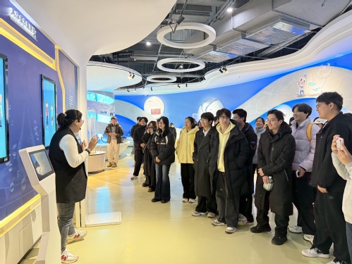 沉浸式体验,感悟节水科技力量。在讲解员的带领下,师生们依次参观“水的世界”“生命之源”“节水行动”“共创未来”四大展区,近距离观察膜分离技术演示、智能水务管理系统、雨水回收装置等与学院研究方向紧密相关的技术设备。馆内采用模型演示、实物展示、互动展项等现代化展览技术,全面介绍了天津市水情状况及水资源分布、引滦入津、南水北调等调水工程概况,家庭节水用水常识、自来水的生产流程、天津节水工作开展情况及节水技术原理及应用等知识。学生们对“虚拟水流体感系统”“城市水循环动态模型”等互动展项表现出浓厚兴趣,在体验中直观理解水资源循环利用的科技原理。