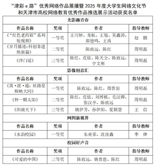 近日,由天津市教委、市委网信办联合主办的“津彩e路”优秀网络作品展播暨2025年度大学生网络文化节和天津市高校网络教育优秀作品推选展示活动获奖名单正式公布。我校师生在4类作品中,累计荣获一等奖、二等奖、三等奖8项,赵鹏、周明磊、李烨荣获优秀指导教师,学校获评优秀组织单位。
