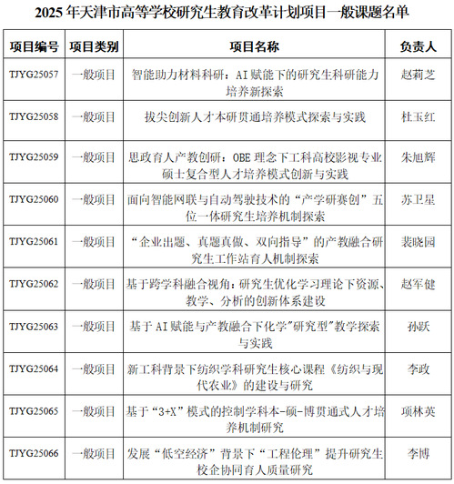 近日,天津市教委发布了《关于公布2025年天津市高等学校研究生教育改革研究计划项目立项名单的通知》,我校推荐申报的13项课题均获批立项,其中重点课题3项,一般课题10项。同时,天津市教委还发布了《关于公布2025年天津市高等学校研究生教育改革研究计划项目重大课题名单的通知》,根据天津市研究生教育发展需要,在已立项的重点课题中择优认定一批重大课题,我校姜勇教授负责的“新质生产力导向的电子信息领域卓越工程师培养体系创新研究与实践”课题成功入选。