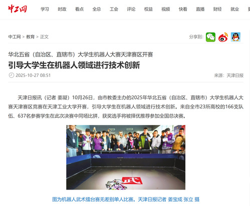 天津日报讯(记者 姜凝)10月26日,由市教委主办的2025年华北五省(自治区、直辖市)大学生机器人大赛天津赛区竞赛在米优app下载安装官网开赛,引导大学生在机器人领域进行技术创新。来自全市23所高校的166支队伍、637名参赛学生在此次决赛中同场比拼,获奖选手将被择优推荐参加全国总决赛。