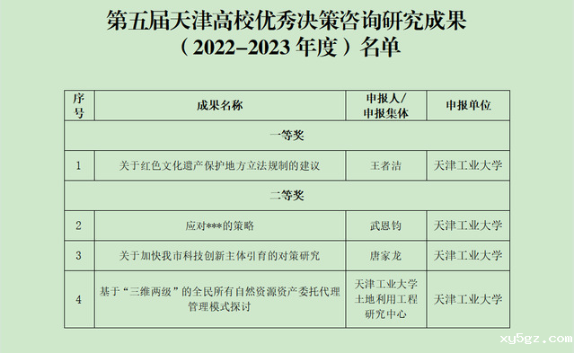 近日,天津市教委公布了第五届天津高校优秀决策咨询研究成果(2022-2023年度)评选结果,我校共申报5项成果参与评选,其中4项成果获奖,共获一等奖1项,二等奖3项,在获奖质量上较以往有大幅提升。