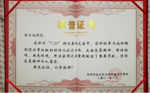 今年暑假,河南遭遇特大暴雨侵袭,牵动了全国人民的心。控制科学与工程学院党委师生积极参与抗洪救灾志愿服务。人工智能学生党支部入党申请人陈文达在郑州特大暴雨灾害中,主动参与郑州市北林路街道办事处组织的防汛救灾工作,协助工作人员搬运救灾物资、发放救灾物资、登记灾情信息等,因表现优秀,郑州市金水区北林路街道为其颁发荣誉证书。入党申请人韩天聪在河南省汛情严重期间,志愿参与河南长垣市、卫辉市防汛救灾志愿服务,进行物资的征集、清点、搬运、分发等工作。研究生第一党支部书记赵佳佳老师,在河南洪水退去时,主动参与到中华志愿者协会应急救援委员会邯郸服务队中,前往河南获嘉县黄堤镇开展消杀工作,为灾后疾病预防贡献自己的力量。