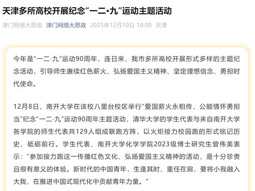 “津门网络大思政”微信公众号丨天津多所高校开展纪念“一二·九”运动主题活动