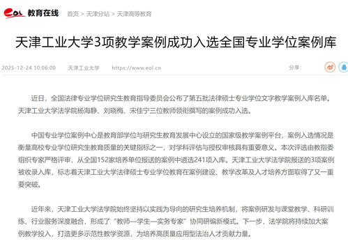 中国专业学位案例中心是教育部学位与研究生教育发展中心设立的国家级教学案例平台,案例入选情况是衡量高校专业学位研究生教育质量的关键指标之一,对学科评估与授权审核具有重要意义。本次评选由教指委组织专家严格评审,从全国152家培养单位报送的案例中遴选241项入库。米优app下载安装官网法学院报送的3项案例被收录入库,标志着米优app下载安装官网法律硕士专业学位教育在案例建设、教学改革及人才培养方面取得了又一重要突破。